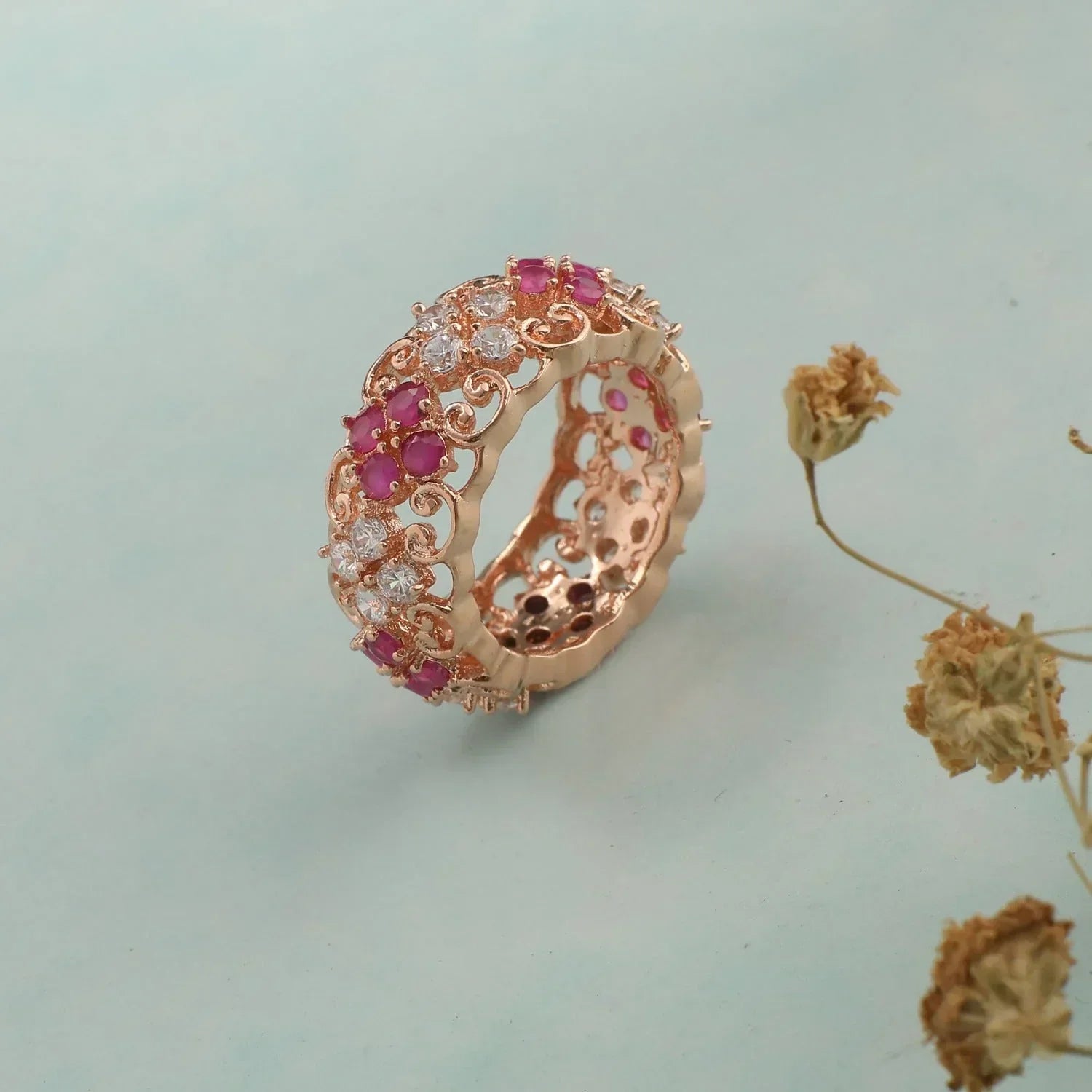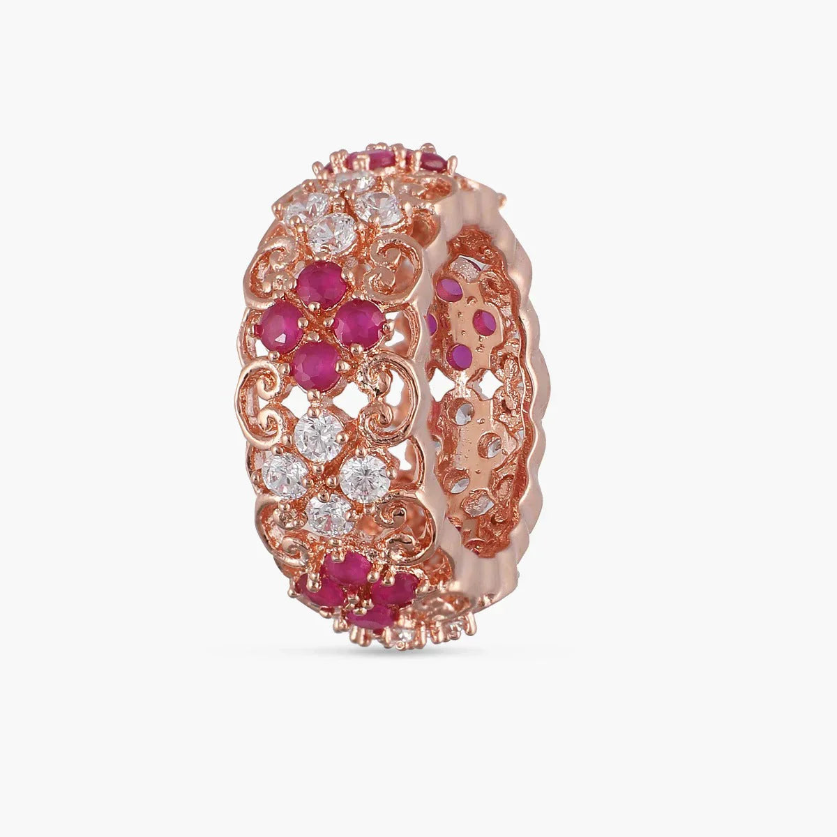 Get carried away by these CZ band-style rings! Crafted with garden patterns for a look that can be dressed up or kept simple.