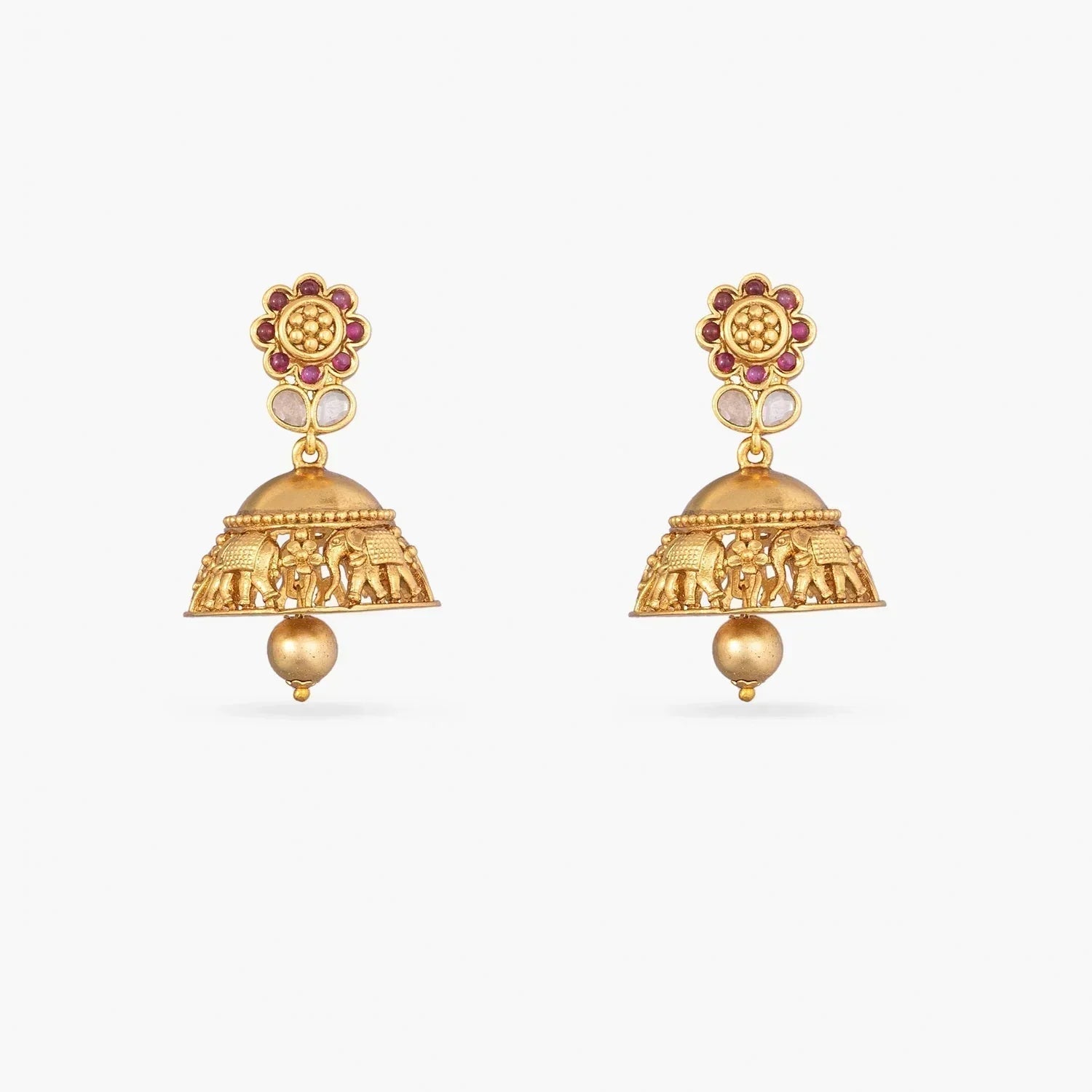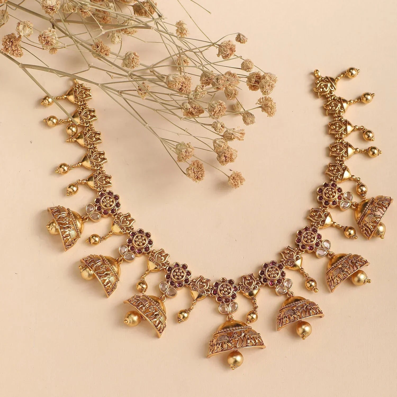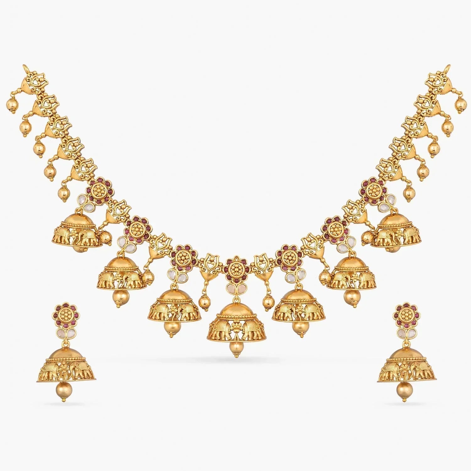 . Featuring an antique gold base curved with bell-shaped motifs, encrusted with CZ stones that add a shine. Choose this for festivals or any bridal events.