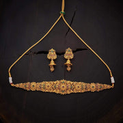 Bridal Choker Necklace & Jhumki Set With Cut-Work Pattern & Dazzling Stonework About the Product: Displaying meticulous craftsmanship, this antique necklace set is rich in beautifully carved ethnic motifs such as charming paisleys, floral vine and tri-petal flowers. This bridal choker is beautified with intricate carvings, magnificent cut-work and alluring stone...