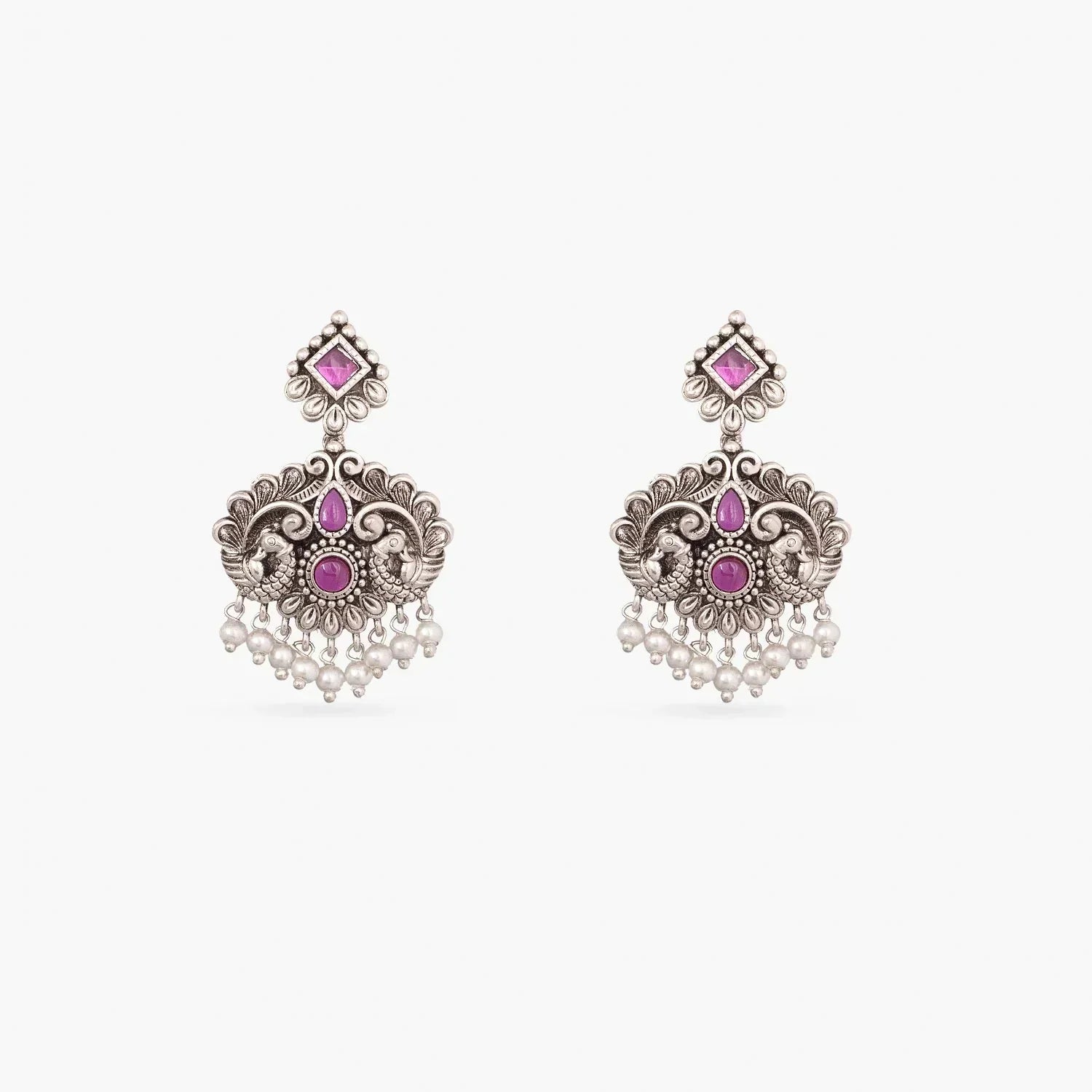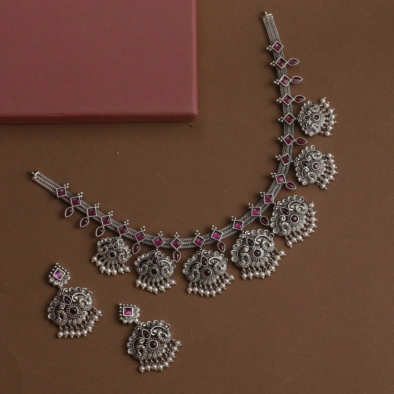 The Mura Oxidized Necklace Set is inspired by timeless Indian traditional motifs with modern aesthetics. The necklace features CZ stones and pearl drops giving a classic look.