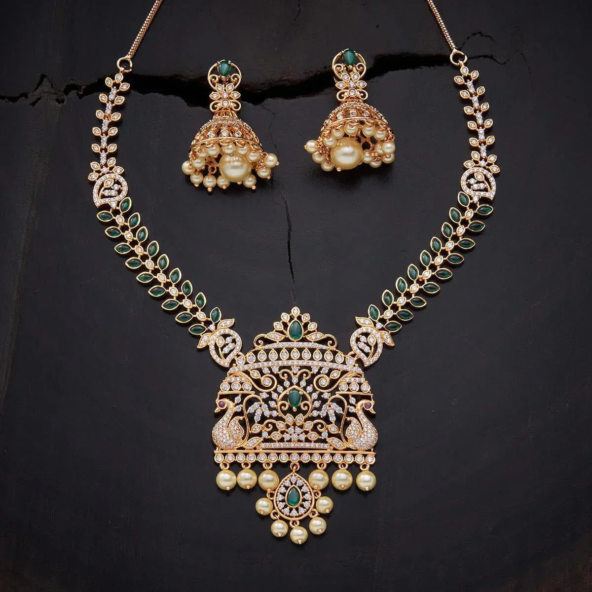 Base Metal: Copper Alloy Stone: Zircon Product Weight (gms): 47 Earring Weight: 21 Earring Length (cms): 4 Earring Style: Jhumkas Earring Closure Type: Push Back Product Details: Adjustable Chain