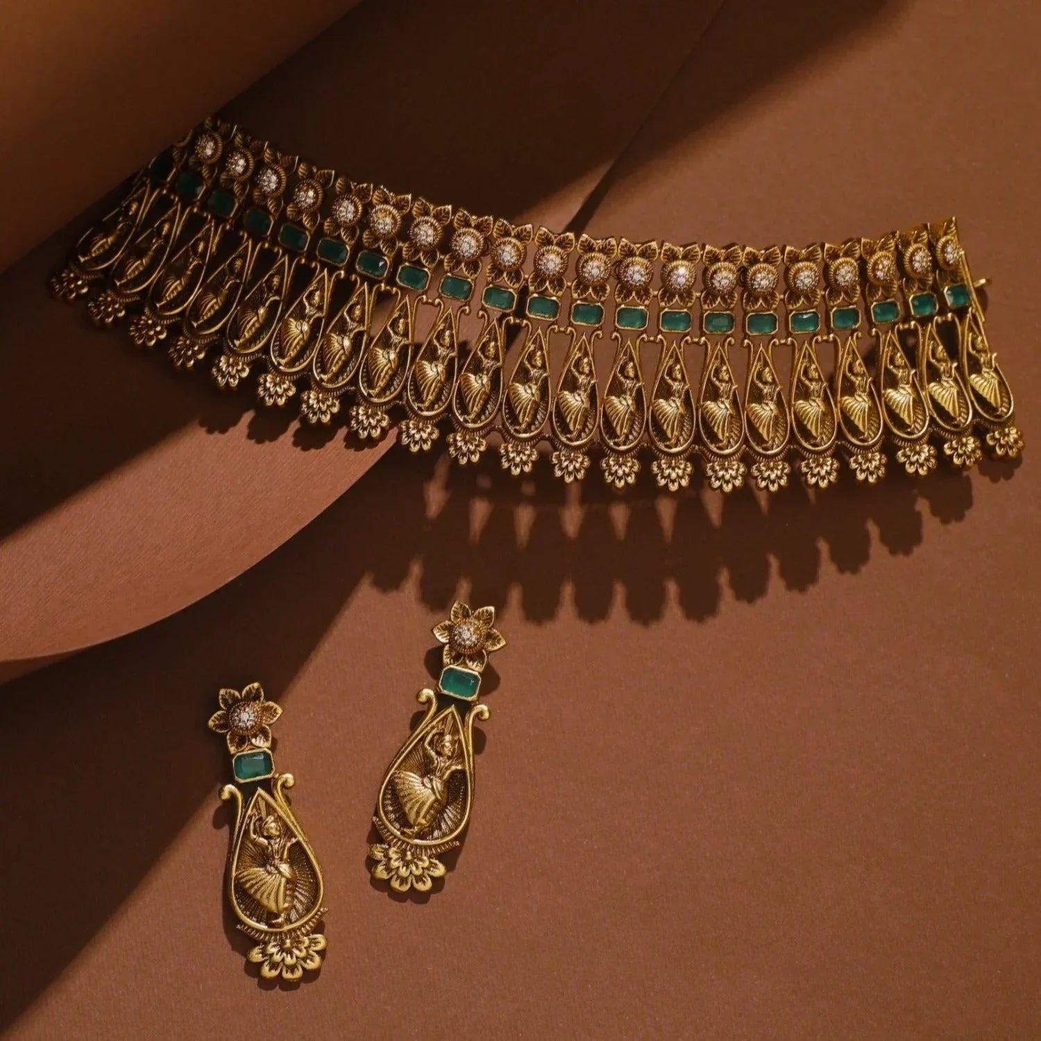 presents a new dancing lady antique choker set inspired by Indian heritage and culture. Refined and elegant yet dramatic and modern, this classic choker can be worn on any rich silk outfits.