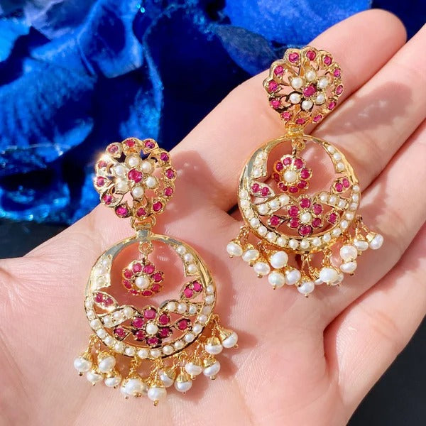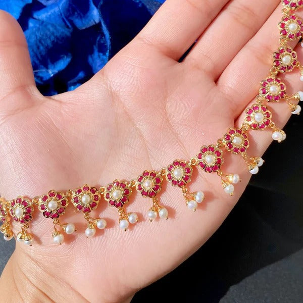 Handcrafted using the traditional jadau technique of jewellery making, this delicate necklace set features rubies and pearls. The set is made of 925 sterling silver and adorned with freshwater pearls and ruby look alike red stones. The hanging beads are real rubies and pearls, adding a touch of elegance to this exquisite piece of jewellery. Combining timeless chic with intricate craftsmanship, it is the perfect accessory for any special occasion. The earrings close with a bombay screw and the necklace comes with a complimentary tassel.