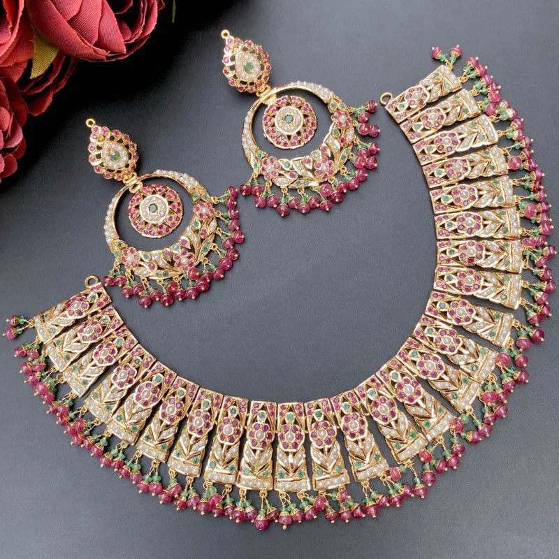 Featuring a classic traditional jadau necklace that never goes out of style. Embellished with rubies, emeralds and pearls.