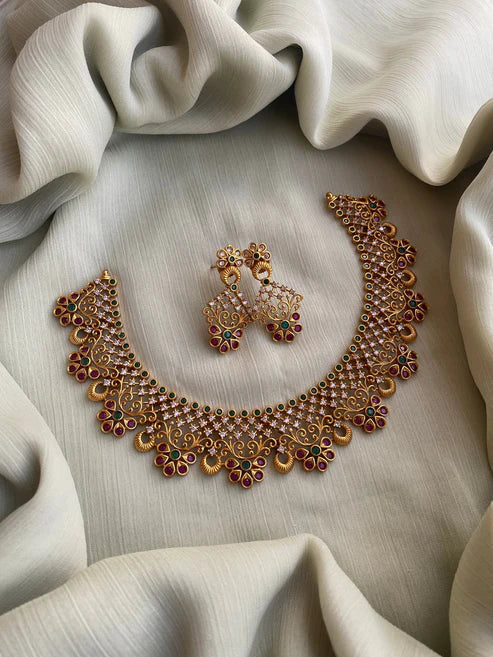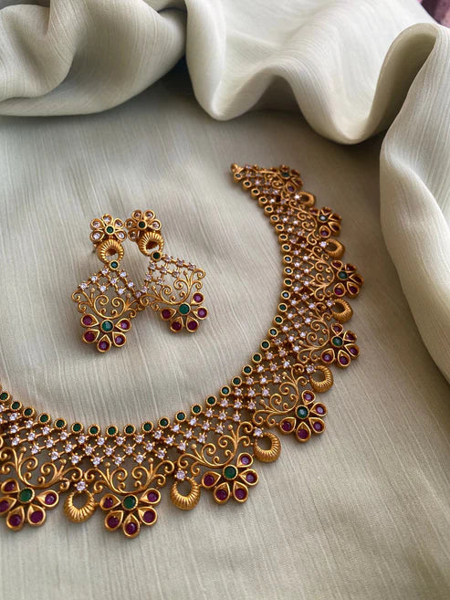 Product description : Gold Plated Kemp Necklace Handcrafted with Tints of Dark Ruby & Green Flower Design Comes With a Matching Pair of Earrings and Embossed with intricacies of Stone Work.
