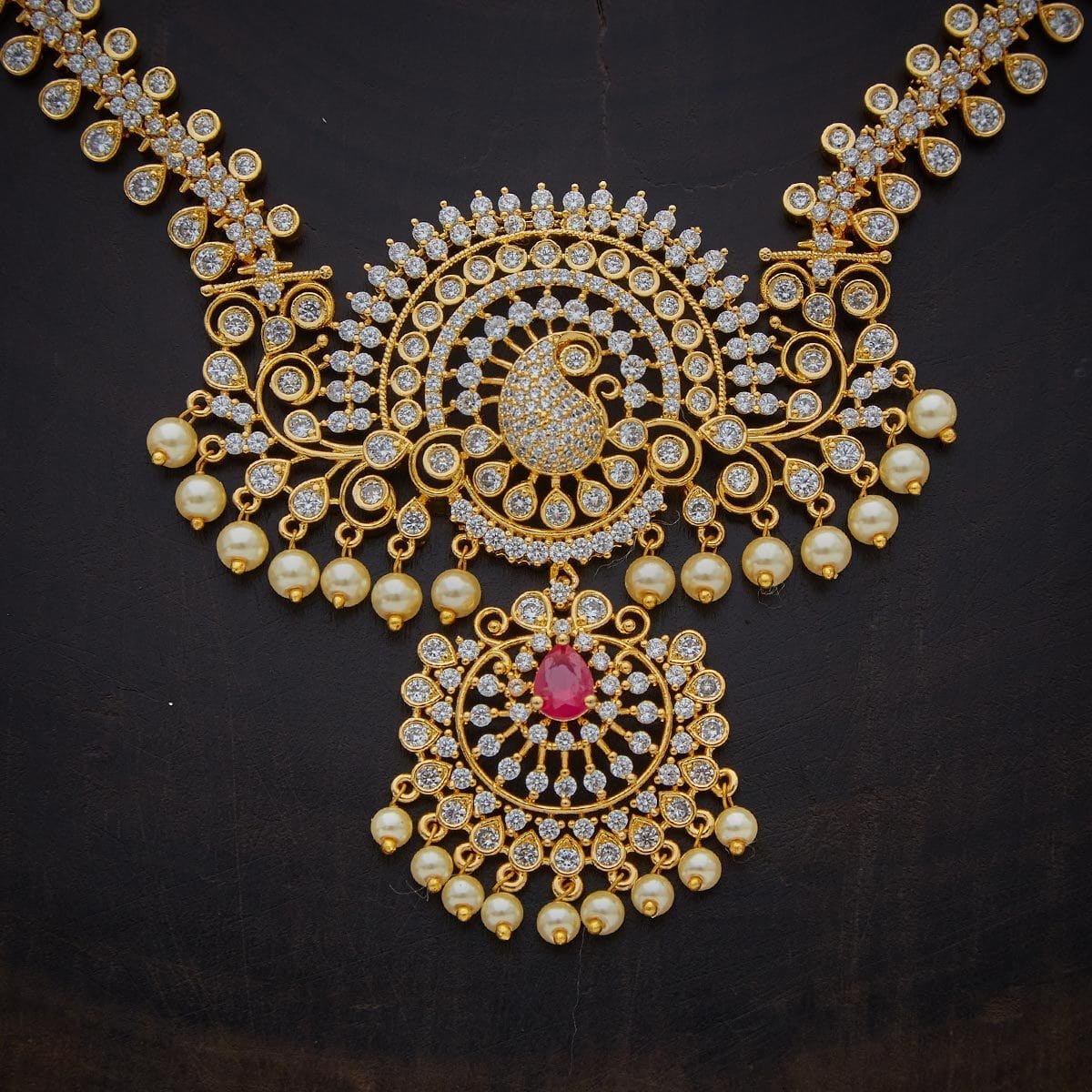 Gold-Plated Addigai Necklace With Traditional Motifs & Stonework